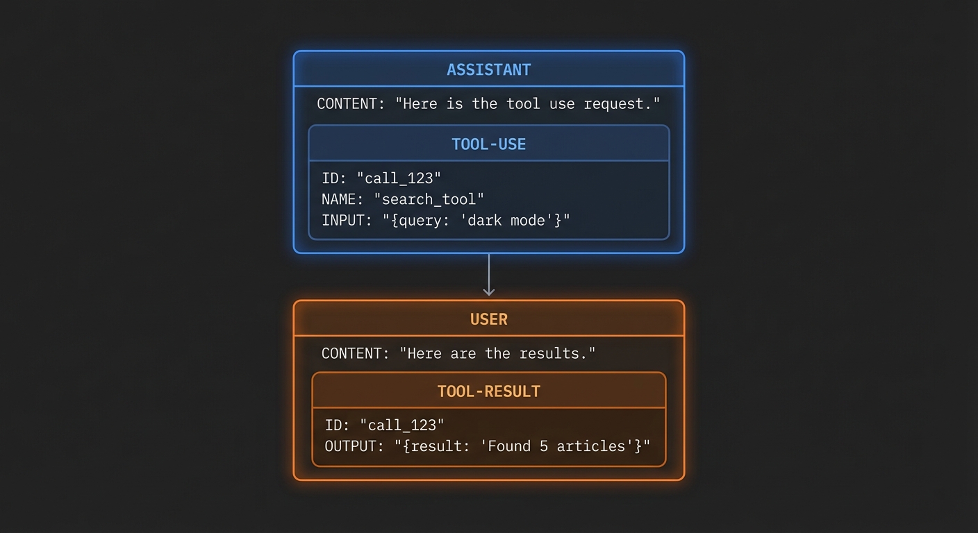 | Multiple tools | All results in one user message | Each result is a separate tool message |