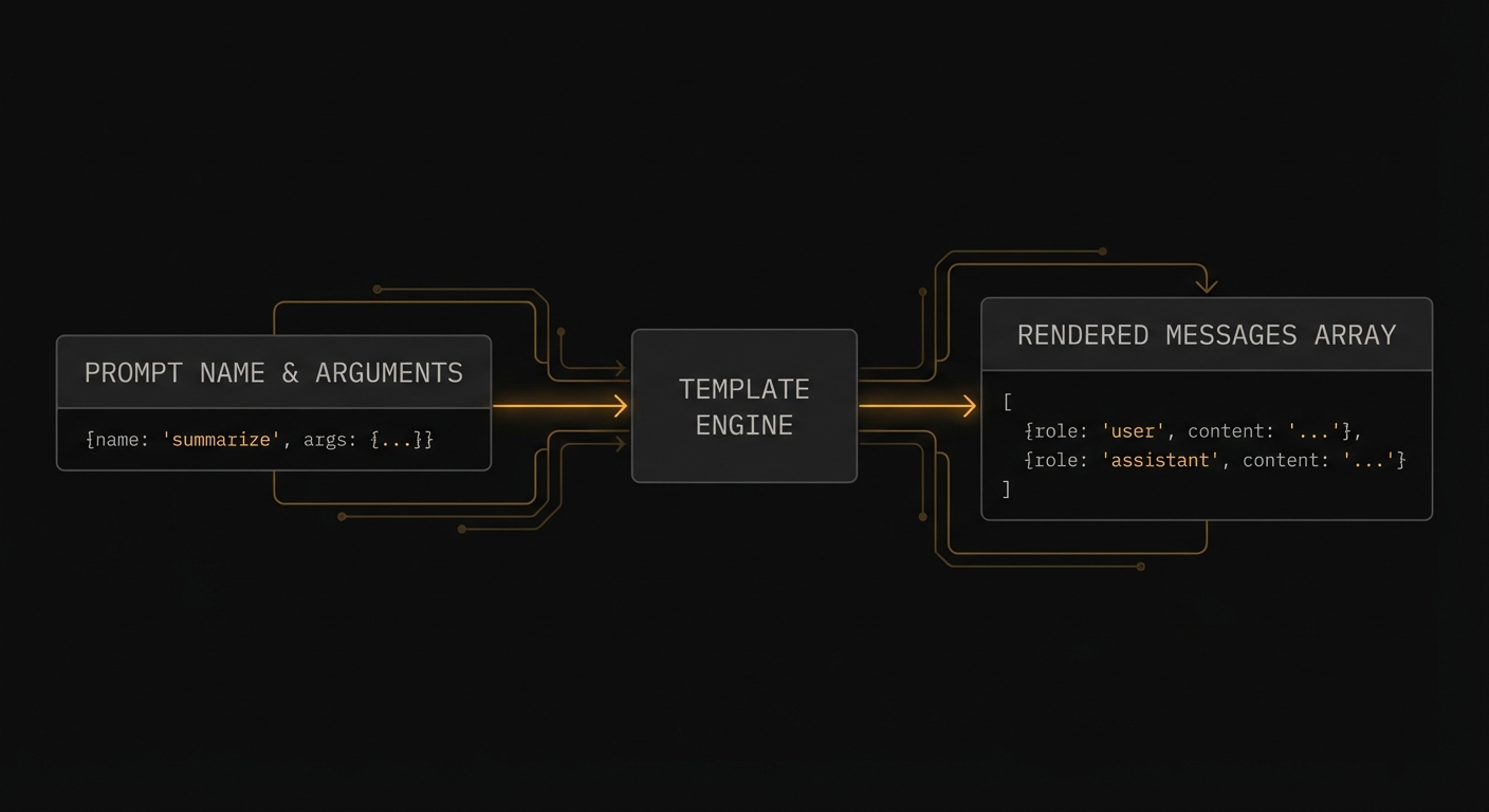 The key difference from tools: prompts are human-initiated workflows. A user explicitly selects a prompt from the host UI (“Code Review”, “Summarise Document”, “Translate to French”). Tools are model-initiated – the LLM decides to call them based on context. Prompts are the programmatic equivalent of slash commands.